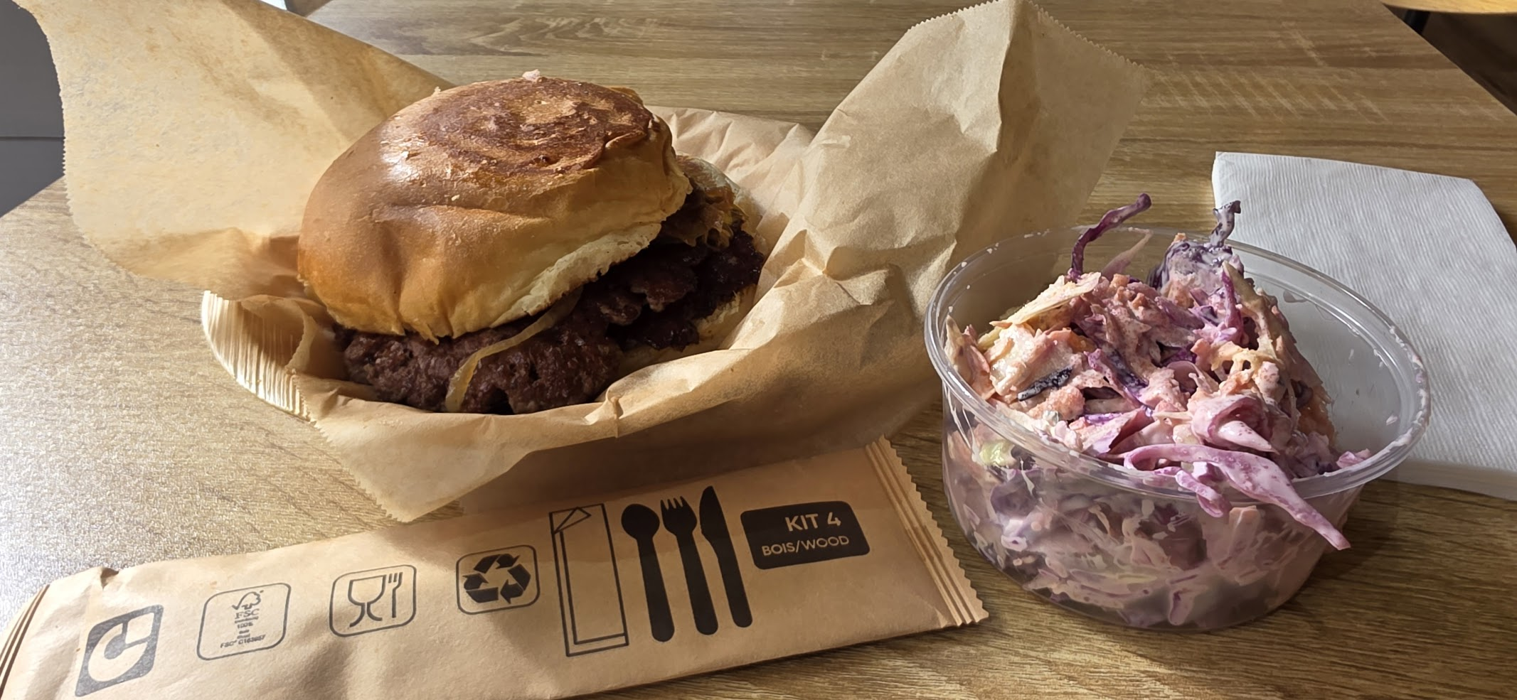 Alors, ce burger ? D'abord le packaging est moins fun que chez Classic. On est dans le jetable basique avec la pochette de couverts en bois qui me déprime. C'est un autre changement de paradigme : Encore aujourd'hui, si vous prenez un kebab sur assiette, vous aurez de la vaisselle. Pour moi, ça compte.