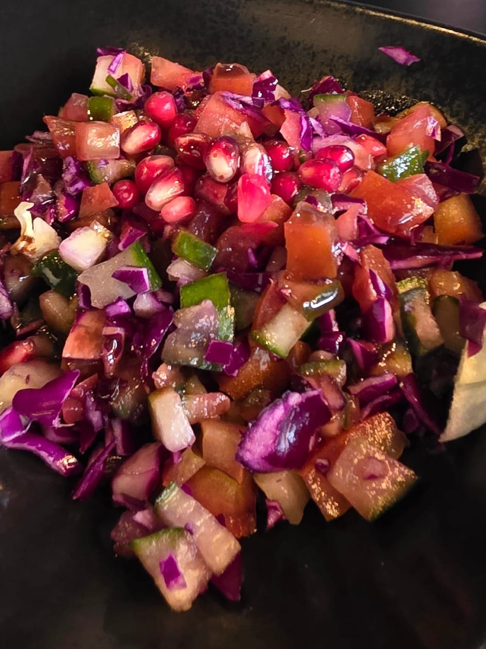 Mais regardez cette jolie salade Shirazi Fresh. 6 CHF de fraîcheur et de découpe au scalpel. L'interprétation est originale puisque la grenade et la mélasse de grenade - ajoutées ici avec la générosité qui fait la signature du lieu - ne font pas partie de la recette classique. Il en résulte un hors-d'œuvre à la fois savoureux, gourmand et rafraîchissant.