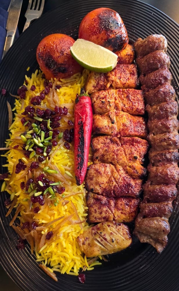 On dézoome pour admirer un assortiment de brochettes, Koobideh et Saffron Chicken Grill cuit au grill à gaz et savamment assaisonné. Ce qu'il y a de bien, c'est que vous pouvez mixer les brochettes comme vous voulez, ce qui permet de goûter plusieurs choses tout en choisissant ce qui vous plaît le plus. Pareil pour le riz en accompagnement. Ici, le terme "à la carte" prend tout son sens.