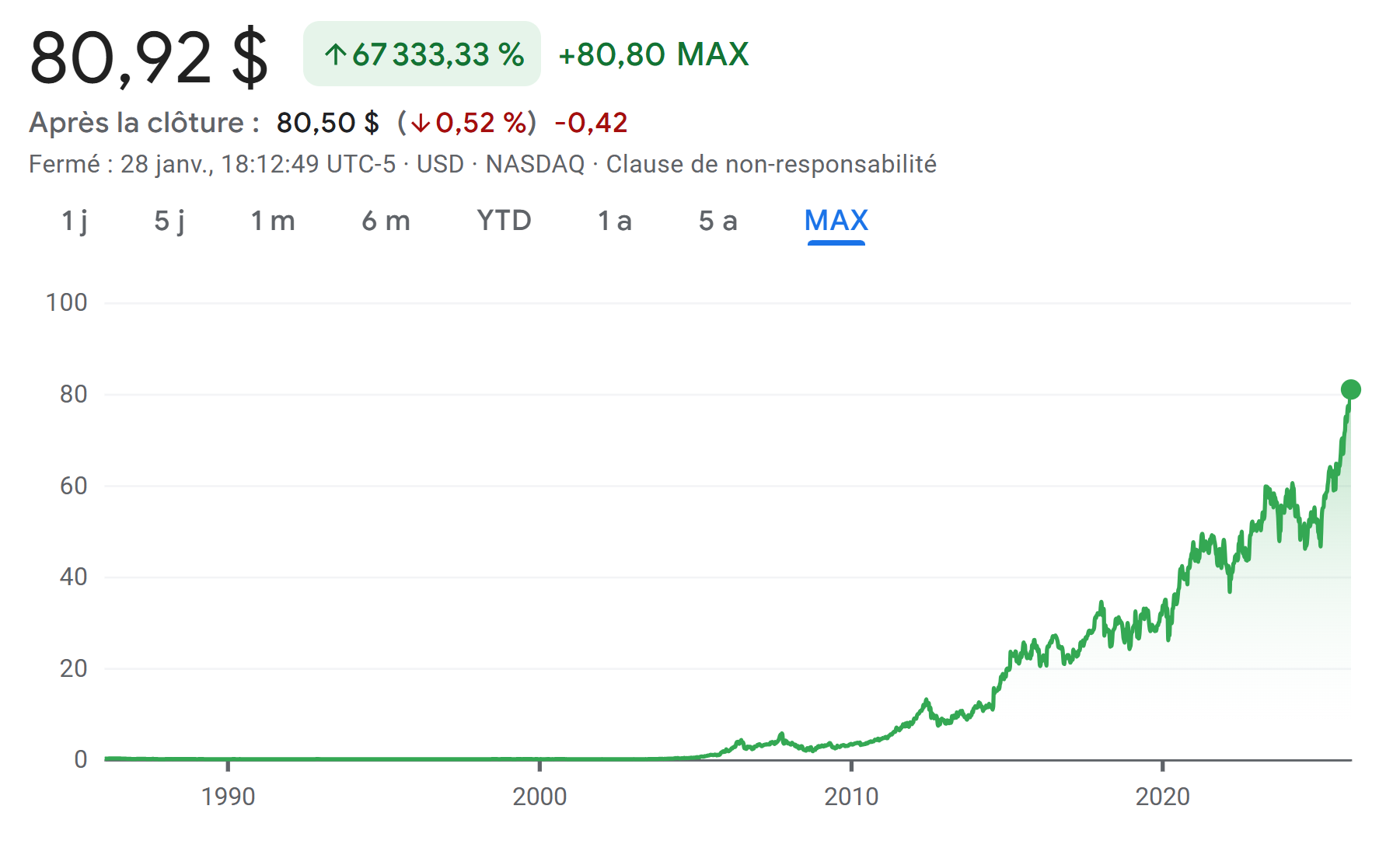 Le cours de son action reflète une conquête du monde qui continue à ce jour. Si vous ne vous y connaissez pas trop en finance, ce graphique explique en gros, que pendant que la Silicon Valley suait sang et eau pour inventer le futur, une boisson au goût de bonbon chimique et au logo en forme de griffure est devenue, sans faire de bruit, l'investissement le plus rentable de ces trente dernières années, devançant même Amazon.